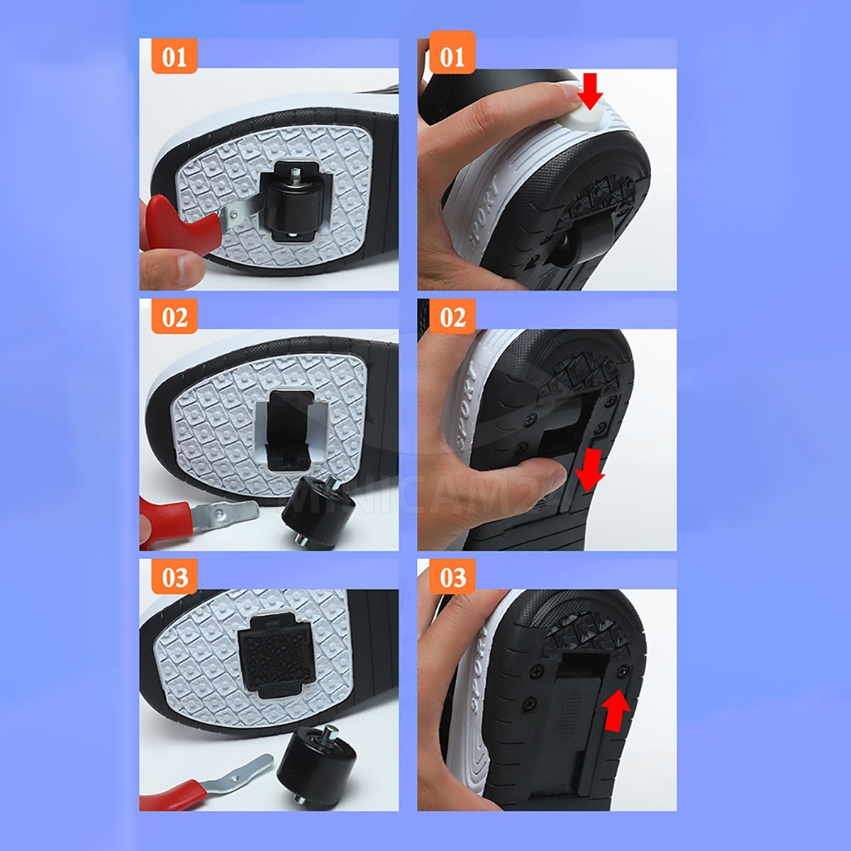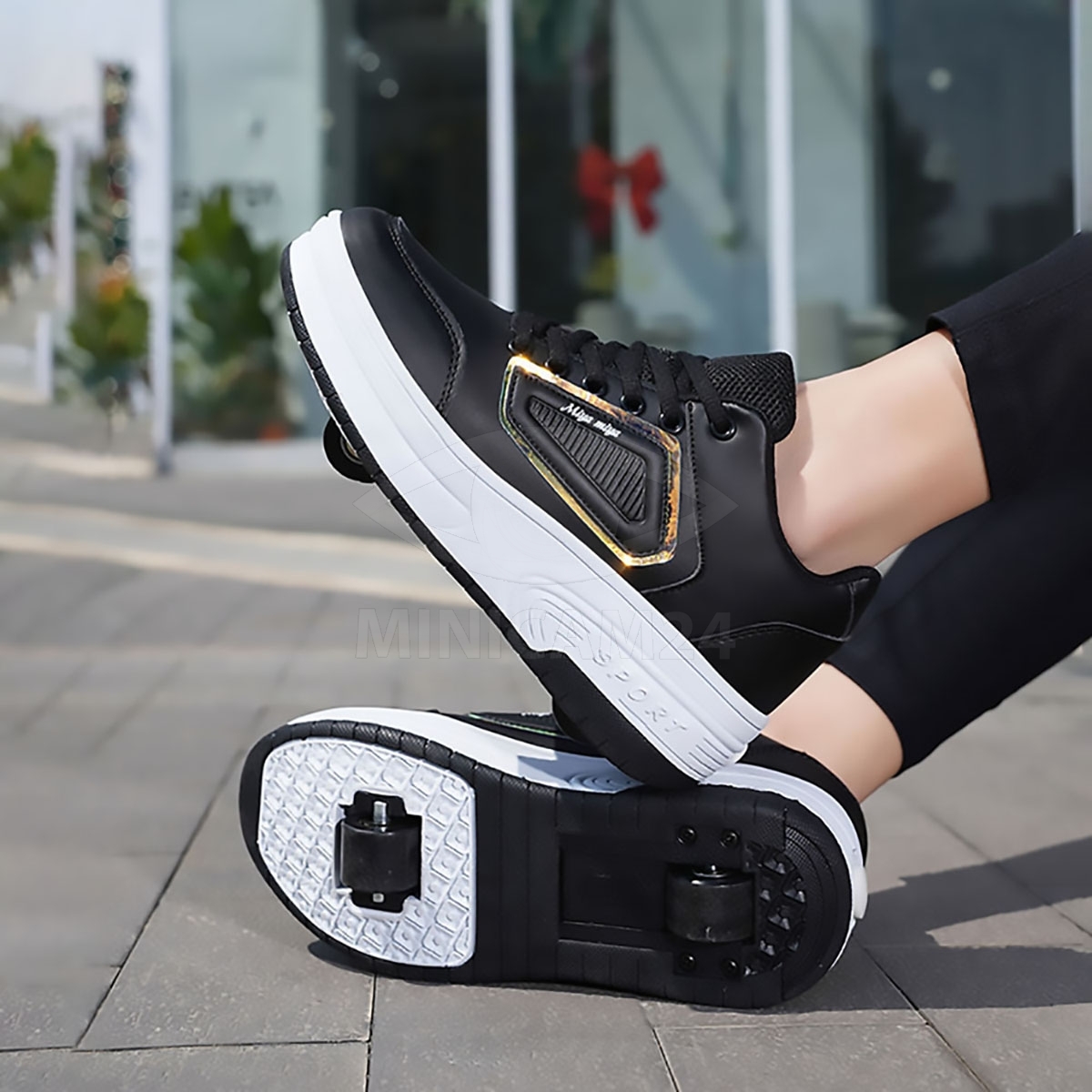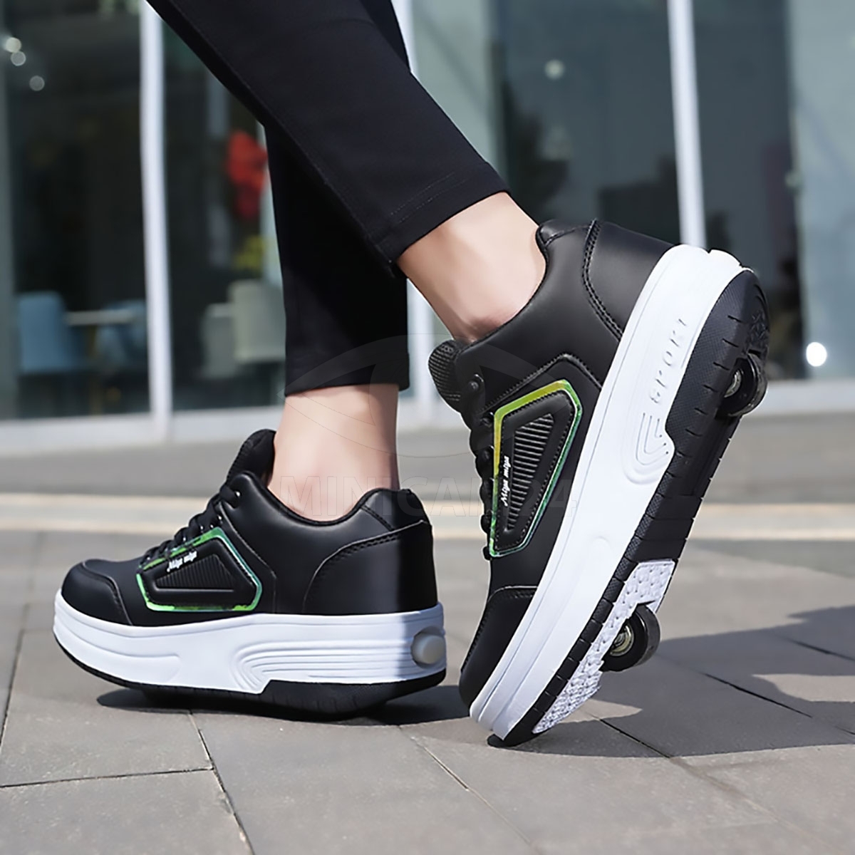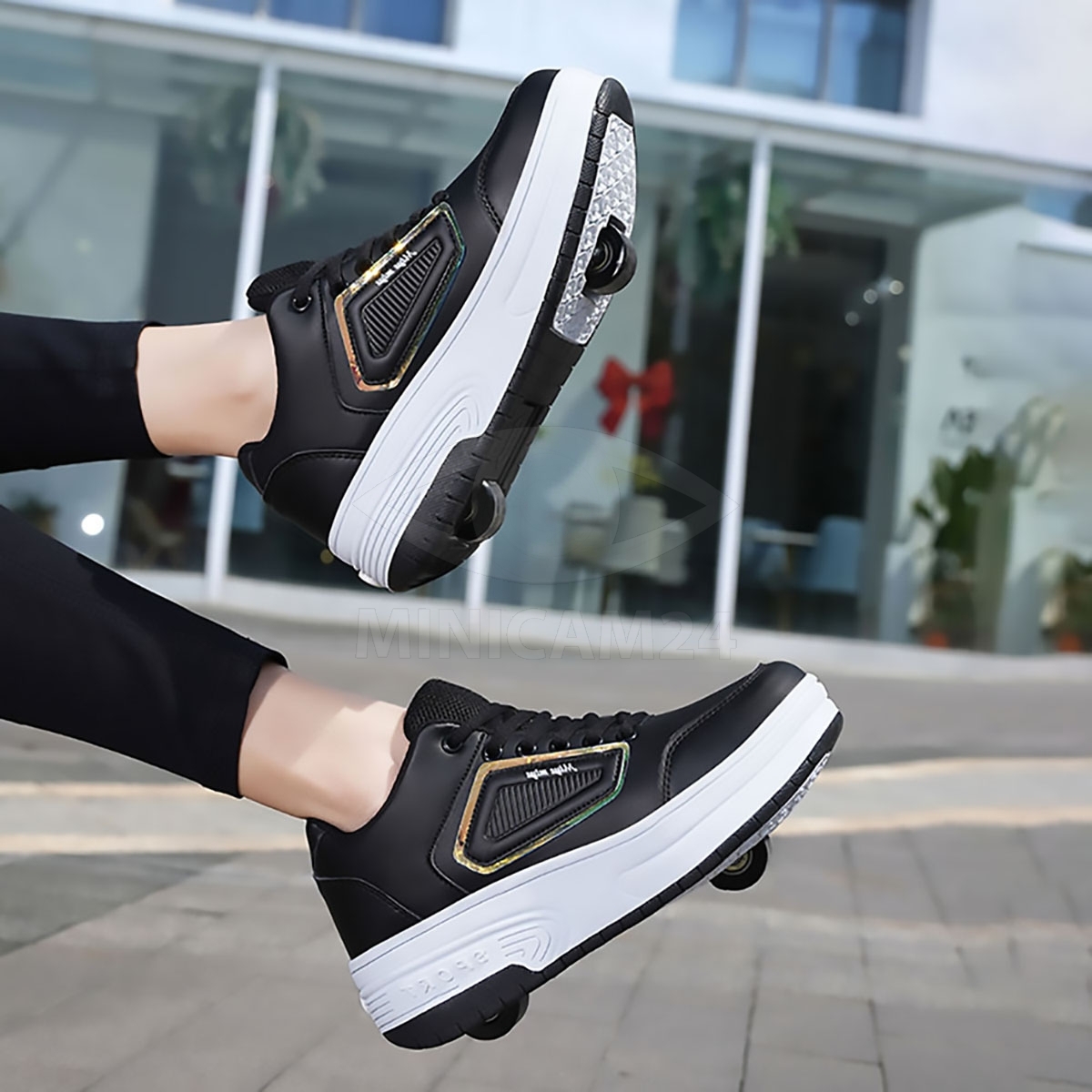 Кеды во съемными роликами  3 в 1: Могут использоваться как двухколесные ботинки, одноколесные ботинки (снимите переднее колесо и добавьте чехол) или плоские кроссовки (удерживайте кнопку за ботинками, чтобы уменьшить заднее колесо и снять переднее колесо).